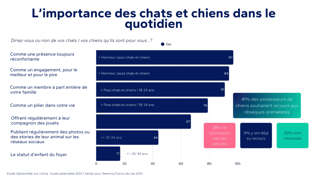 L’animal de compagnie s’impose comme membre à part entière de la famille, voire comme un enfant du foyer pour près de 67% des possesseurs interrogés. Il symbolise une présence réconfortante (97%), un engagement durable (94%), un pilier du quotidien (91%). Ce « pet parenting » façon 2025 se traduit par de nouvelles habitudes (câlins, jeux, balades, soins), des pratiques digitales (photos, stories, comptes réseaux sociaux), et une attention constante à son bonheur, allant jusqu’à fêter son anniversaire ou lui offrir des cadeaux à Noël. La montée des attentes autour du bien-être animal, de la santé, des soins personnalisés, de l’accompagnement en cas de perte (obsèques animalières), favorise l’émergence de nouveaux marchés de services et d’accessoires, du funéraire à la pet sitting en passant par la téléconsultation vétérinaire.