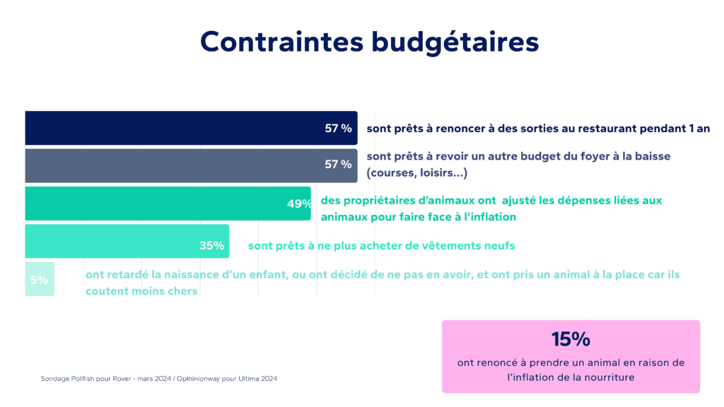 Face à l’inflation, 49% déclarent avoir ajusté leur budget pet : renoncement à des sorties, réduction de certaines dépenses non essentielles, recours accru au comparatif d’offres et au second marché pour les accessoires. Toutefois, le lien émotionnel avec l’animal amène à des sacrifices budgétaires ailleurs : 57% sont prêts à revoir d’autres budgets du foyer (courses, loisirs), 35% à ne plus acheter de vêtements neufs, 15% ont même reporté un projet d’enfant ou adopté un animal à la place.